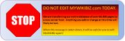 | 14:22, 9 April 2010 | STOP editing MWB.jpg (file) | 115 KB | Notice to visitors not to edit or add new content to MyWikiBiz, until further notice. | 1 | |