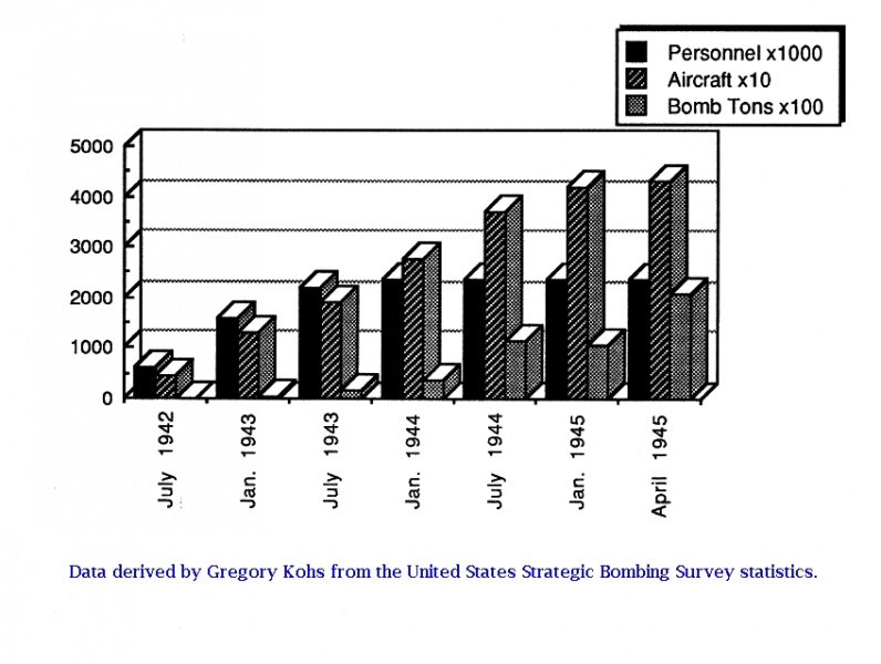 Derived by Gregory Kohs from the United States Strategic Bombing Survey, this graph represents statistical data about numbers of American personnel in the Army Air Force, number of aircraft, and tonnage of bombs dropped.