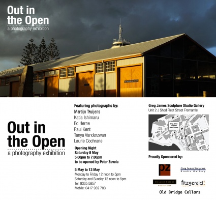 ‎Greg James Sculpture Studio Gallery and Photographer Peter Zuvela, would like to present, Out in the Open, a photography exhibition, featuring the work of six local photographers: Tanya Vanderzwan, Ed Herne, Laurie Cochrane, Paul Kent, Katia Ishimaru and Martijn M. Truijens.