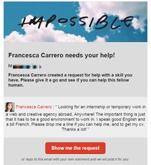 Example of a job hunter on Lily Cole's Impossible social begging network.
